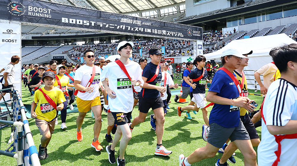 BOOSTランニングフェスタ in 味の素スタジアムとは 味の素スタジアムで、チームで楽しめる「リレーマラソン」を開催!リレーマラソンは走る距離、回数、順番も自由なので上級者も未経験者も一緒に走ることができます!マラソン大会オフシーズンはチームのみんなでタスキを繋いでランニングを楽しみましょう!「会社対抗の部」も用意しましたので、会社の仲間・そのご家族も合わせて会社のファミリーイベントとしてもご活用ください!味の素スタジアムで最高の思い出を!