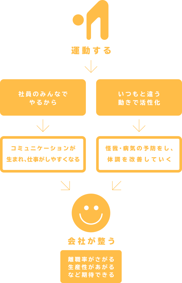 テーマを「仕事」から「スポーツ」に変えることで社員同士の関わり方も変わり、新たな関係が芽生える可能性があります。体を動かすことは、ポジティブな精神状態を醸成し人間関係を作るために良い環境を生み出します。
