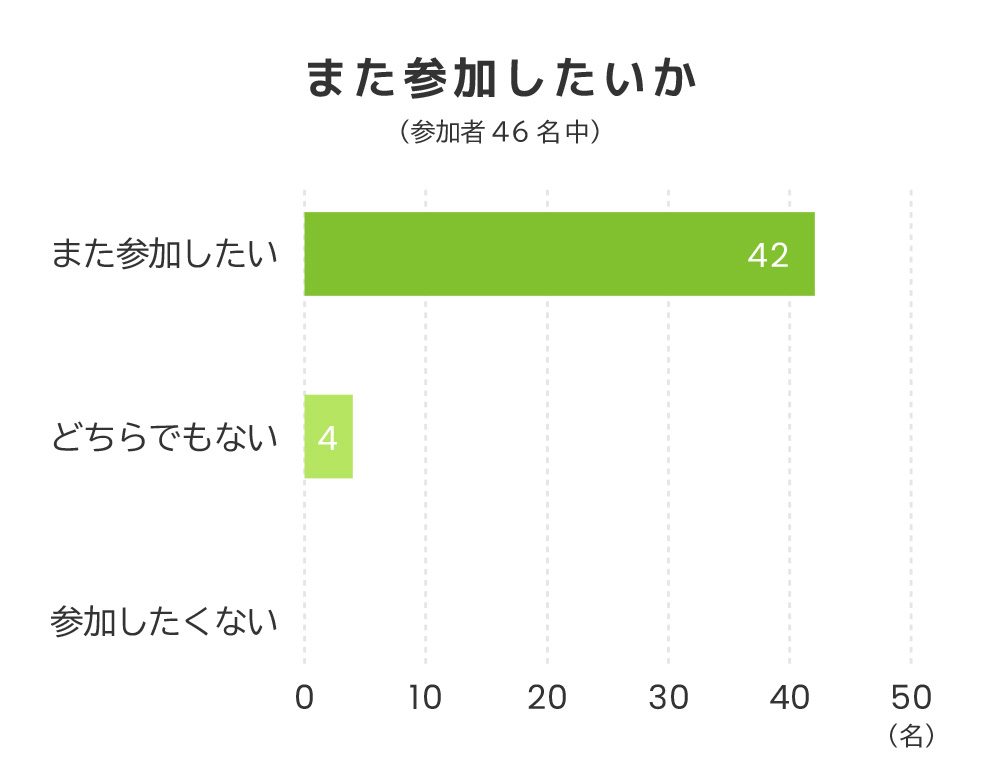 ご参加いただきました皆さまにアンケートにご協力いただきました。集計結果は以下のようになりました。