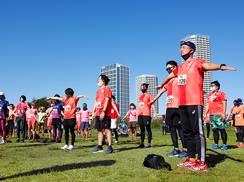 参加者の皆様が安全に楽しく走れるよう、スタート前にランニングトレーナーによる準備運動や走り方レクチャーを行います。指導を行うのは鳥光健仁氏(フィットネスランニング主宰/フィットネスランニングトレーナー)です。
